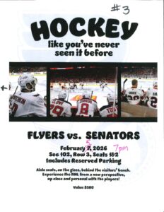 3) Two Flyers game tickets for February 5, 2026, at 7 pm; front seats (section 102, Row 3, aisle seats 1 & 2), right behind the visitors’ bench (opposing team), includes reserved parking. (value $380; starting bid $175).