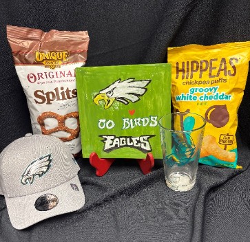 19) Ceramic Eagles trivet made by DeafCAN! special needs client with 4 oz bag of gluten-free Hippeas Chickpea Puffs (white cheddar flavor), a 11 oz bag of Pretzels Splits plus an Eagles cap and glass. (value $67; starting bid $30).
