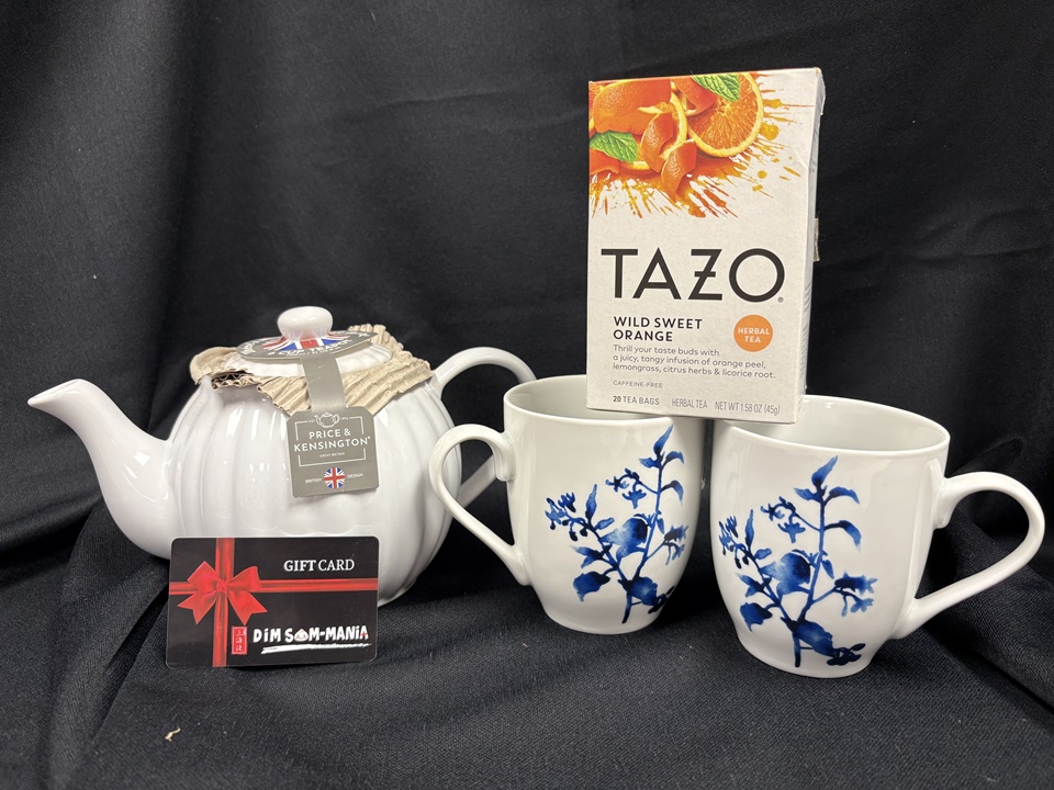 7) Price & Kensington white teapot (Great Britain), two Oneida Tranquility Blue mugs, 20 tea bags of Tazo Wild Sweet Orange Tea and a $30 gift card to Dim Sum Mania restaurant in Media. (value $60; starting bid $30).