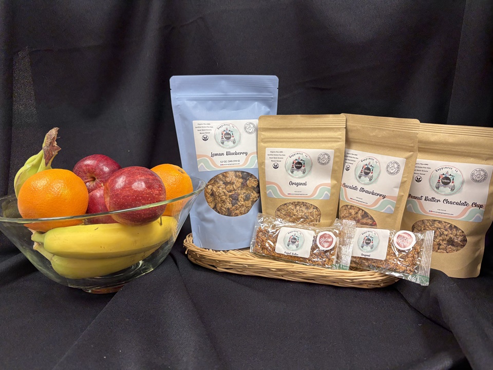 14) Four packages homemade granola (12 oz lemon blueberry, 4 oz chocolate strawberry granola snack, 4 oz original granola snack, 4 oz peanut butter chocolate granola snack, and two gluten-free granola bars (original and peanut butter) with fresh fruit in a glass bowl. The creator, Greta Fairbanks, can be found at www.bringinguhappiness.com. (value $50; starting bid $30).