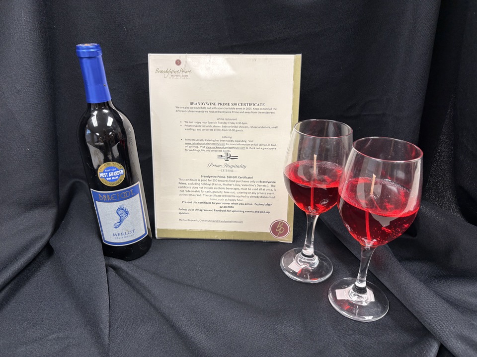 17) $50 gift certificate to Brandywine Prime Seafood and Chops at Chadds Ford Inn www.brandywineprime.com (good thru 12/30/26; excluding holidays), two red candles in wine glasses, and a bottle of Barefoot Merlot of California. (value $80, starting bid $40).