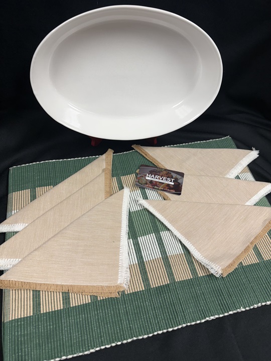 13) Vintage Tagus oval ceramic au gratin dish (microwaveable, freezer, and dishwasher safe, and oven proof) with six green/tan/white woven cloth placemats and napkins plus a $50 Harvest Seasonal Grill gift card (Glen Mills, Collegeville, Lancaster, etc.). (value $90; starting bid $40).