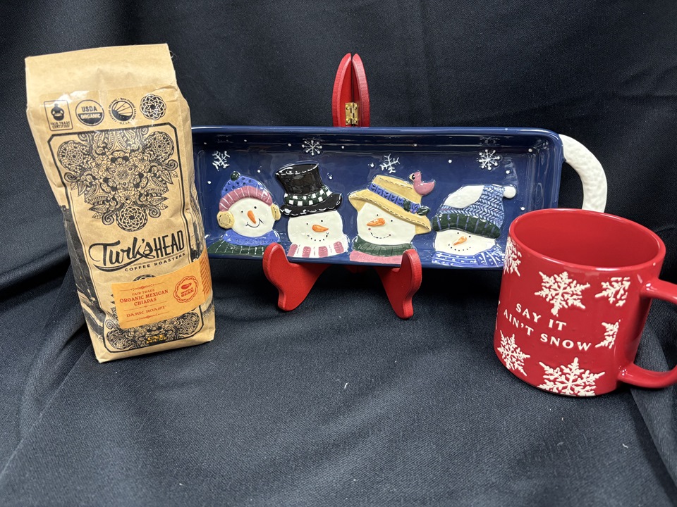 2) 1 lb. Turks Head Fair Trade Organic Mexican Chiapas coffee beans (West Chester, caramel-like dark sugar and buttery sweetness), “Say It Ain’t Snow” mug, and snowman ceramic tray with homemade treats (not shown). www.turksheadcoffee.com (value $25; starting bid $15).