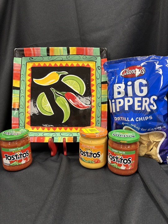 10) Vintage Mexican serving plate, bag of tortilla chips, Tostitos salsa trio. (value $26; starting bid $13).