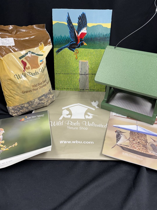 8) Wild Birds Unlimited package–2026 bird calendar, green retro vintage feeder, 5 lb. Tree Nutty Plus wild bird seed blend, 20% coupon at the Glen Mills Wild Birds Unlimited Nature Shop, and an unframed 10” x 14” acrylic painting of a “Red Wing Blackbird Coming to Rest” signed by PA inmate Robin Parmelee. All in a large “Save the Song Birds” canvas bag. www.wbu.com (value $135; starting bid $75).