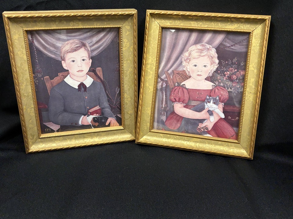 18) Two vintage gold framed 7” x 8” Sullins House Ohio painter Elizabeth F. Gilkey (EFG) 1990 prints of 18th century boy and girl. (value $50; starting bid $25).