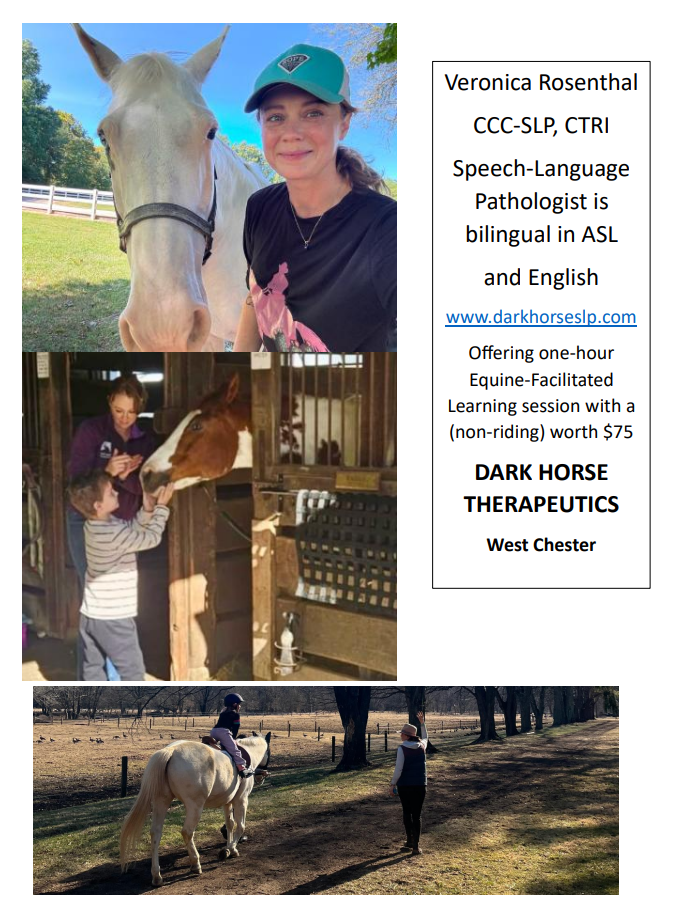 9) Dark Horse Therapeutics: One-hour non-riding Equine Facilitated Learning session with a bilingual trainer (ASL/English) Veronica Rosenthal who is a licensed ASL-fluent speech language pathologist and a certified therapeutic riding instructor in West Chester. www.darkhorseslp.com (value $75; starting bid $40).