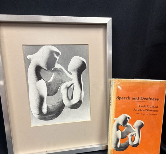 4) Vintage book: Speech & Deafness by Donald Calvert & S. Richard Silverman (1975, Alexander Graham Bell Association for the Deaf, Inc.) with silver metallic frame and matted (13’ x 16”) picture of “Learners,” a 30-inch marble sculpture housed at Central Institute for the Deaf, depicting the child and teacher in the reciprocal act of learning-teaching speech. Its creator is Hillis Arnold of Kirkwood, MO, a member of the Oral Deaf Adults section of the Alexander Graham Bell Association for the Deaf. the Deaf, Inc. (value $75; starting bid $30).