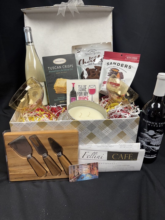 5) Wine basket containing Blue Ridge Pinot Grigio wine, Warwick Valley Winery Harvest Moon wine, a vanilla cashmere scented candle, Time for Juice Cleanse napkins, two large amber wine glasses, Tucson crisp crackers, dark chocolate covered pretzels, small batch Wonders sea salt caramels, set of three Brandai Inox cheese servers, and a $25 gift card to Fellini Café of Media (Italian). (value $100; starting bid $55).