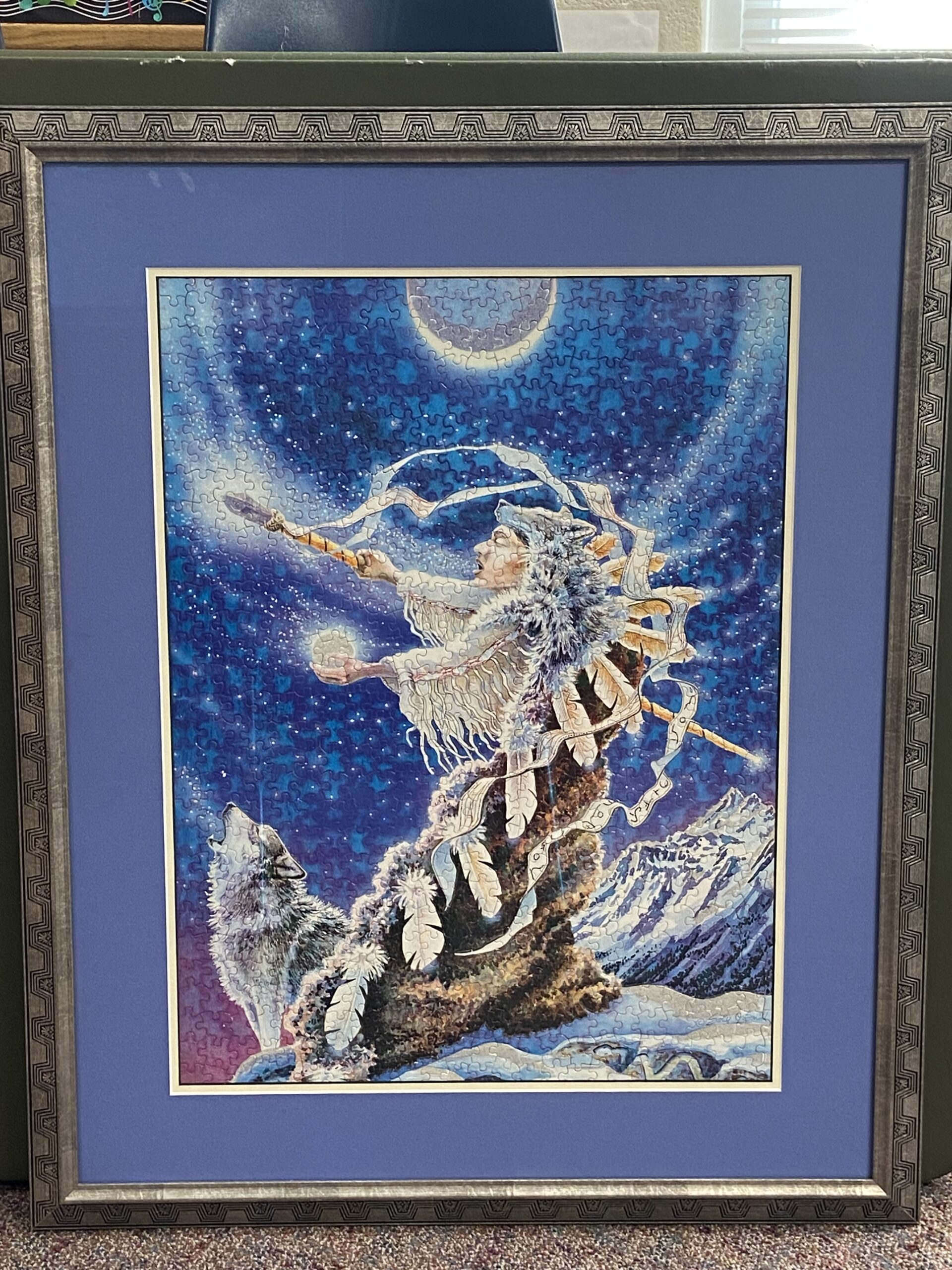 11) Framed blue matted Snow Wizard glitter puzzle picture (31.5’ x 25.5”). (value $140, $60 starting bid).